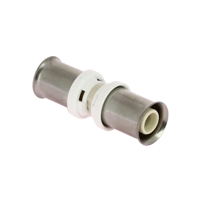 Le raccord union PPSU multicouche à sertir — aussi appelé manchon égal — est la pièce de base pour assembler bout-à-bout deux tubes multicouche de même diamètre. C'est le raccord à connaître pour prolonger une ligne au-delà de la longueur d'une couronne, pour reprendre une coupure accidentelle, ou simplement pour assembler deux sections lors d'un cheminement long. Sa géométrie cylindrique compacte le rend particulièrement adapté aux passages en gaine technique, sous chape ou en faux-plafond, là où un raccord plus volumineux ne passerait pas.